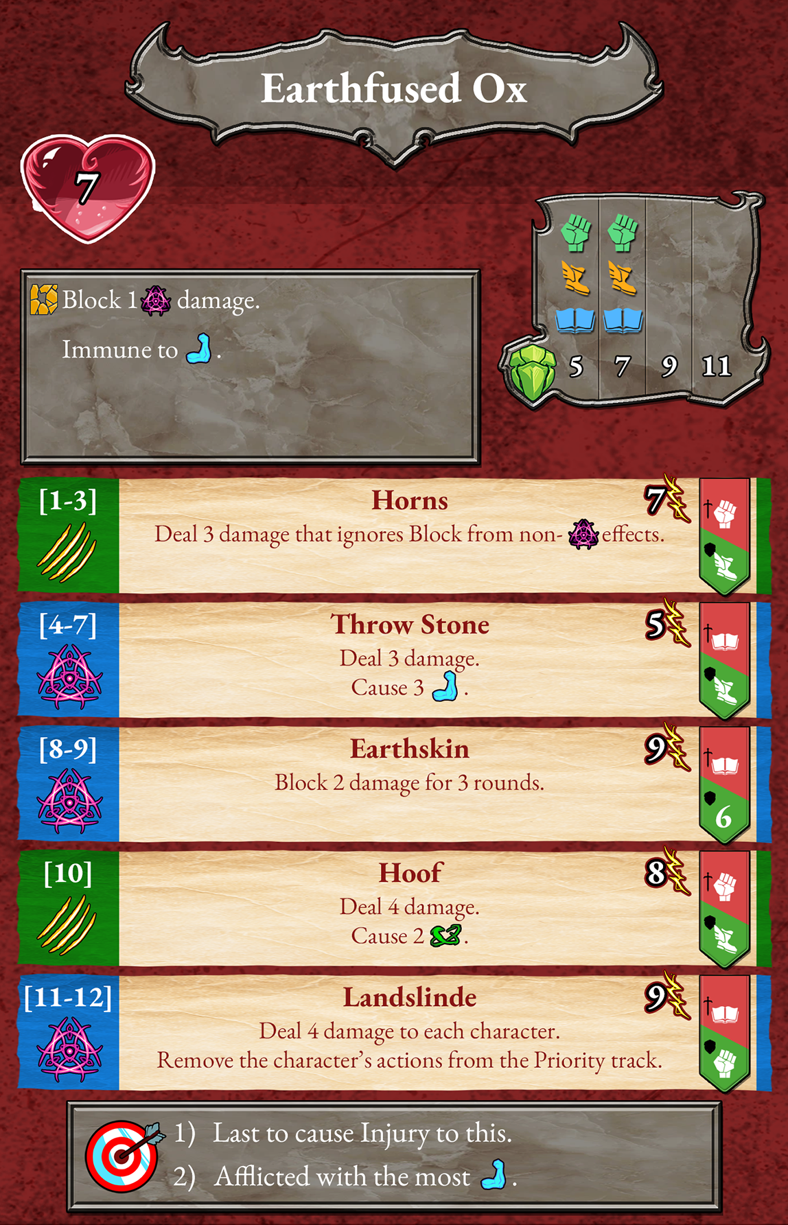 Ailments cause a penalty to fighters. When causing an Ailment, it is added to any amount already afflicting the victim. Ailments can be fully removed as a single ongoing effect. When removing an Ailment from yourself or an ally, that effect works even if other parts of the action require an attack. While Ailments afflict a fighter, they suffer the listed effect: